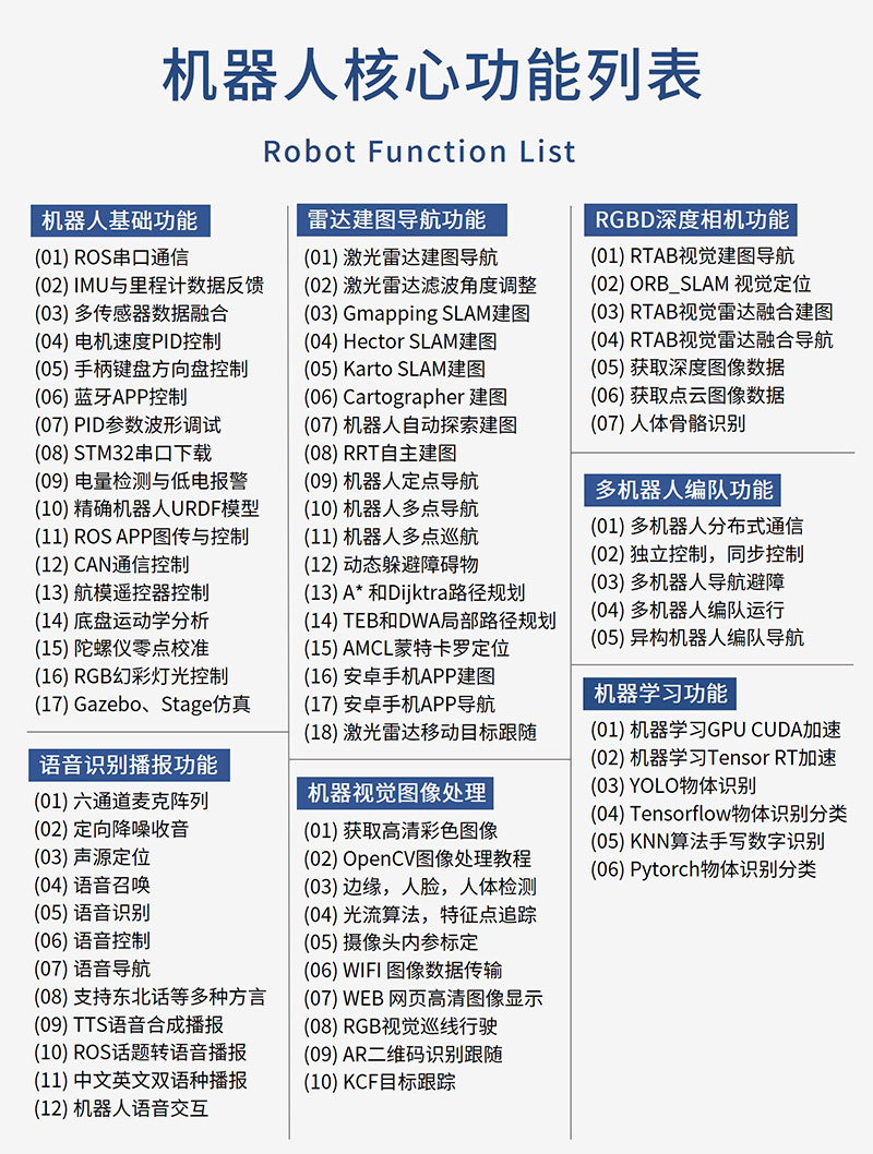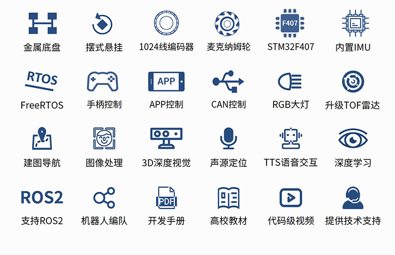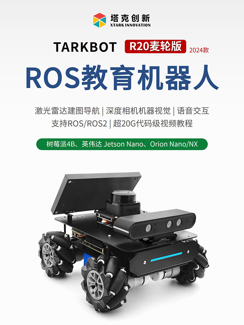 產(chǎn)品簡介:塔克創(chuàng)新TARKBOT R20系列是針對(duì)ROS教育科研的旗艦產(chǎn)品,支持主流的樹莓派4B、英偉達(dá)Jetson Nano、Orion Nano/NX系列主控,支持ROS1和ROS2系統(tǒng)。具有1024線高精度編碼器,STM32F407主控,酷炫可編程RGB彩燈,搭載奧比中光深度相機(jī)、激光雷達(dá)、語音交互配件。可實(shí)現(xiàn)機(jī)器人運(yùn)動(dòng)控制、SLAM建圖導(dǎo)航、機(jī)器視覺、3D視覺、語音控制、跟隨避障、多機(jī)器人編隊(duì)等功能,提供800+頁手冊(cè)和200+源碼級(jí)中英字幕視頻教程,提供技術(shù)支持,可零基礎(chǔ)入門和進(jìn)階學(xué)習(xí)。
